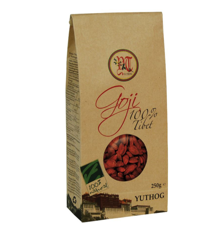 Goji Yuthog son bayas desecadas de la especie Lycium barbarum, cultivadas en la meseta tibetana a más de 4.000 metros de altitud. Recolectadas de forma artesanal y secadas al sol, estas bayas destacan por su sabor dulce con un toque ácido y su textura tierna, similar a las pasas.