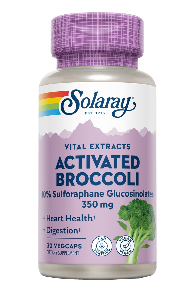 Solaray Activated Broccoli Seed Extract 350 mg es un complemento alimenticio que proporciona extracto de semilla de brócoli (Brassica oleracea italica), estandarizado al 10% de glucosinolatos de sulforafano (35 mg por cápsula). Este suplemento incluye la enzima mirosinasa y brotes de brócoli liofilizados para apoyar la producción de sulforafano en el organismo, un compuesto con propiedades antioxidantes y beneficios para la salud cardiovascular y digestiva.